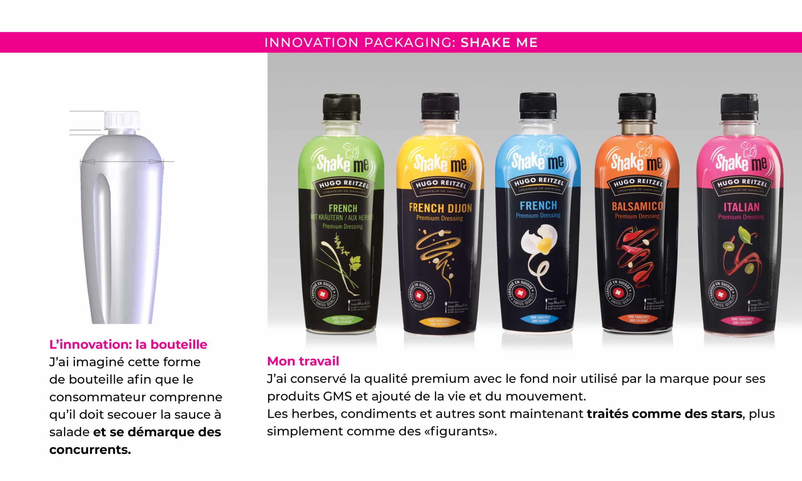Pour la grande distribution, je conserve le fond noir premium — il fonctionne — mais j’y insuffle du mouvement et de la sensorialité. Les cornichons et oignons deviennent les vraies stars du packaging, traités avec gourmandise. J’ai également développé un flacon shaker innovant pour rendre le concept produit immédiatement compréhensible.