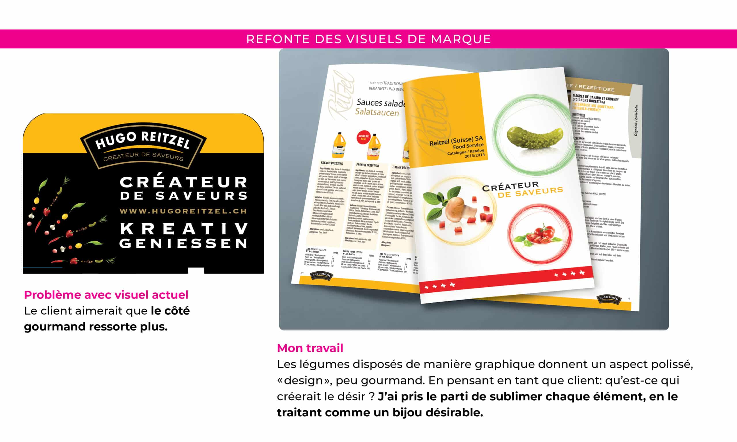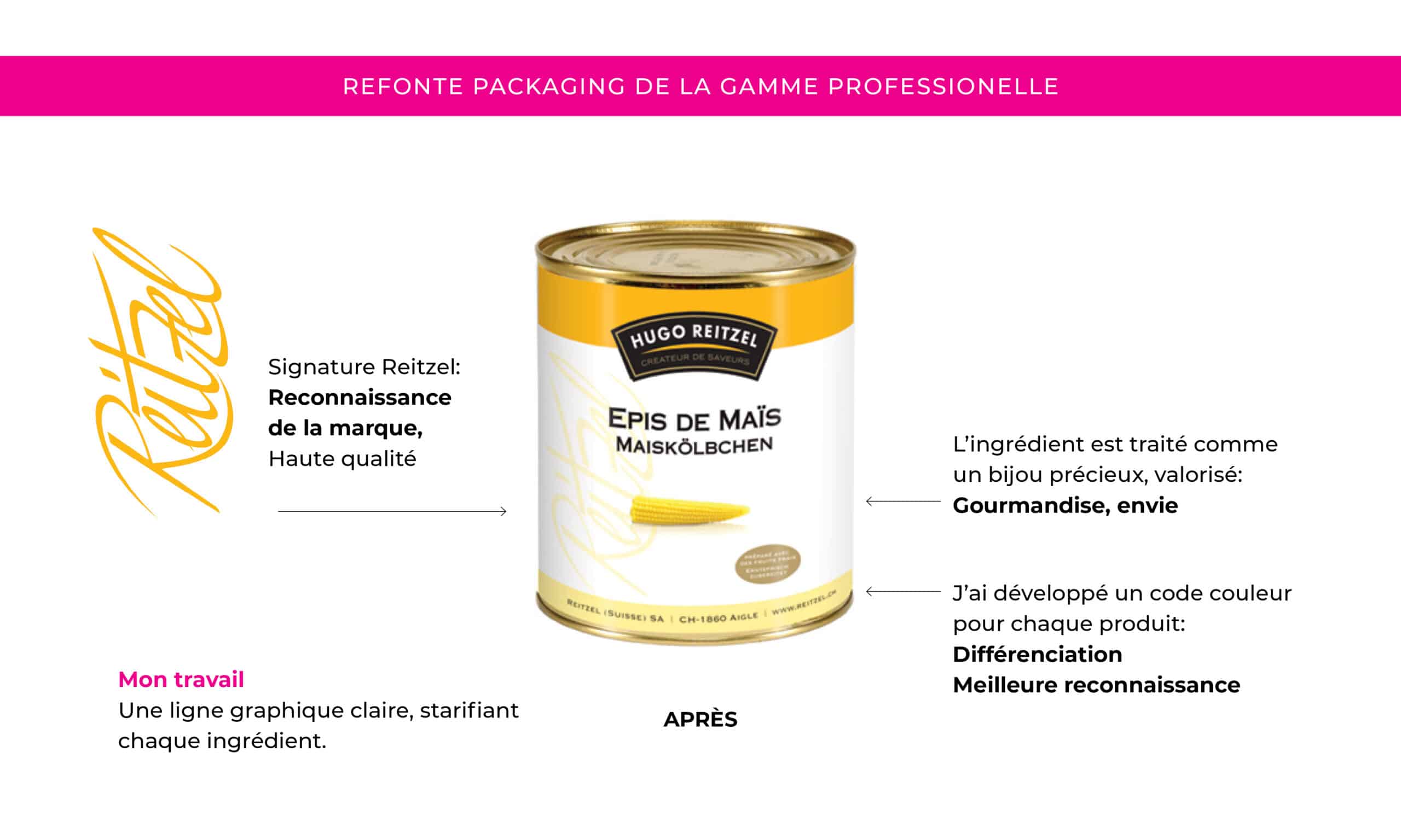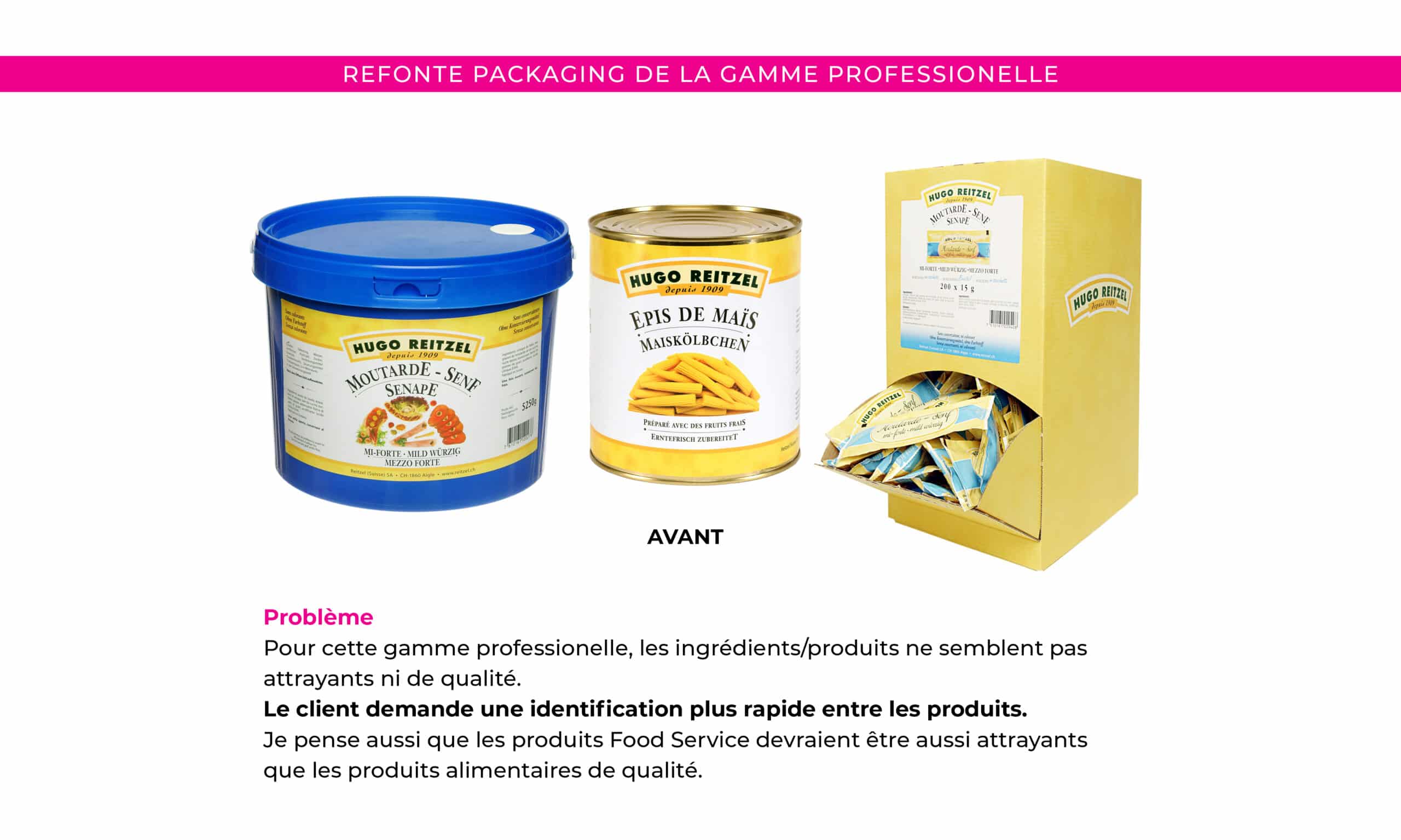Pour le food service, j’applique la même logique d’appétence et j’introduis un code couleur par produit pour une navigation rapide et intuitive. Les deux gammes gagnent en cohérence visuelle — food service devient aussi premium que la grande distribution.