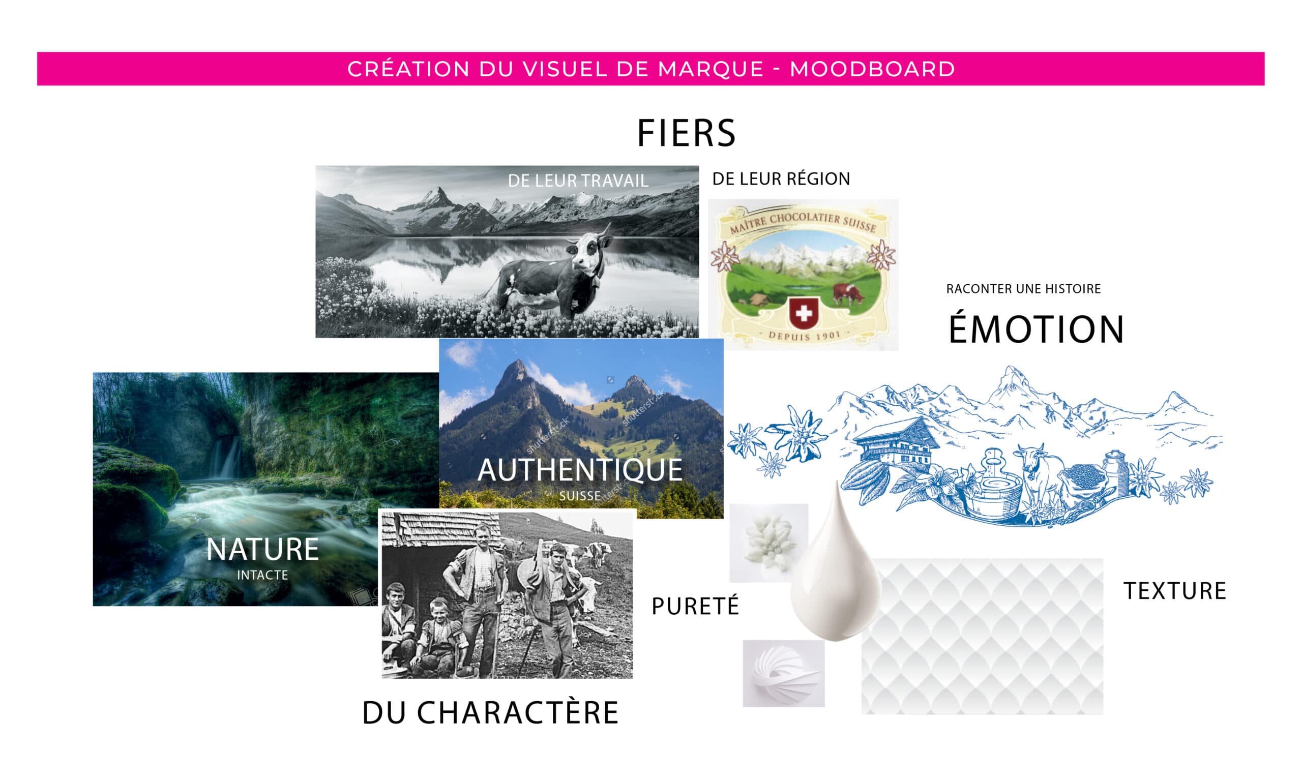 Je réintroduis le paysage suisse, la vache, le chalet — mais traités avec caractère, pas de façon générique. J’ajoute un papier texturé pour apporter de la sensorialité : en magasin, on ne peut pas goûter le chocolat, mais on peut le ressentir. Un code couleur clair différencie chaque recette pour faciliter la navigation en rayon. Et la phrase en français — marque d’authenticité — retrouve sa place sur l’emballage.