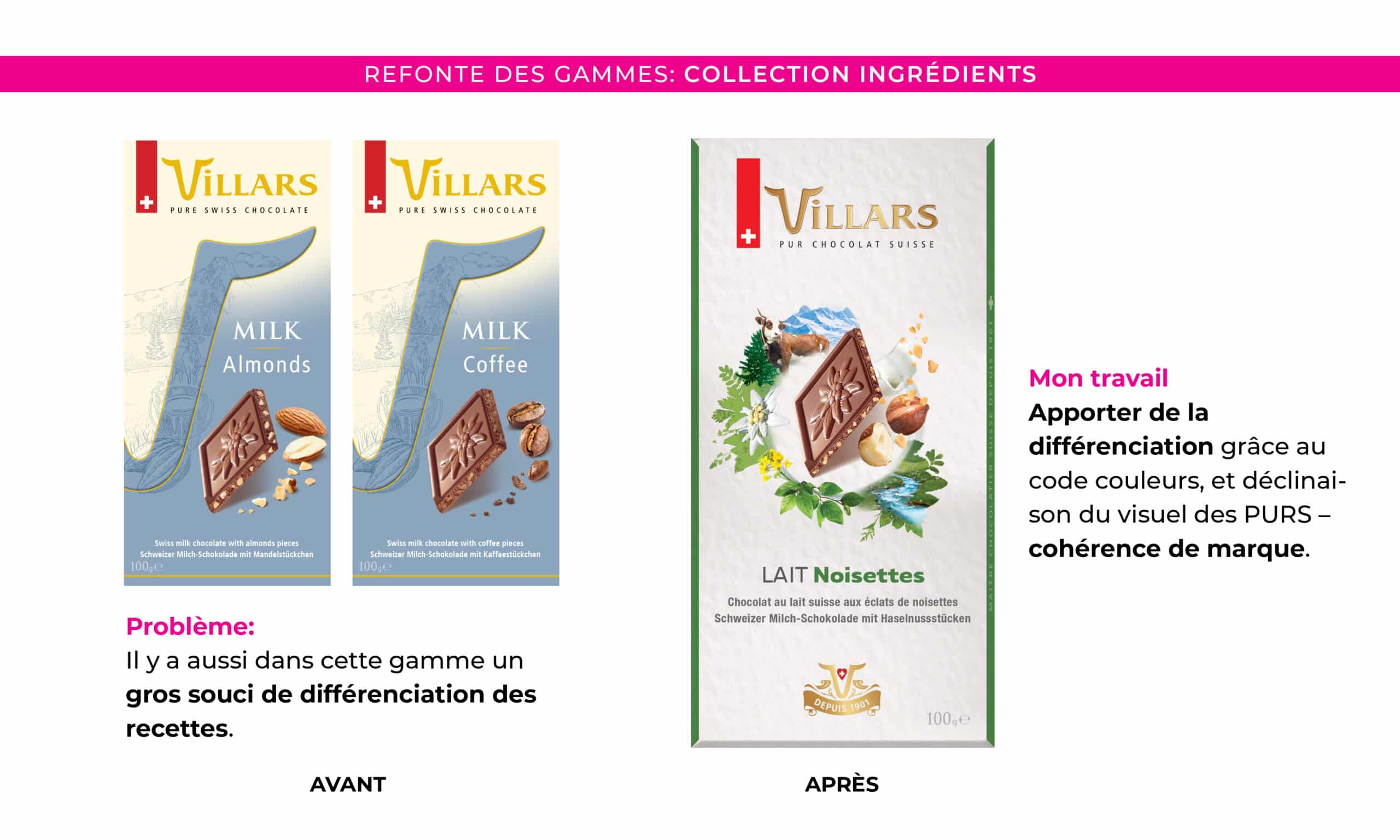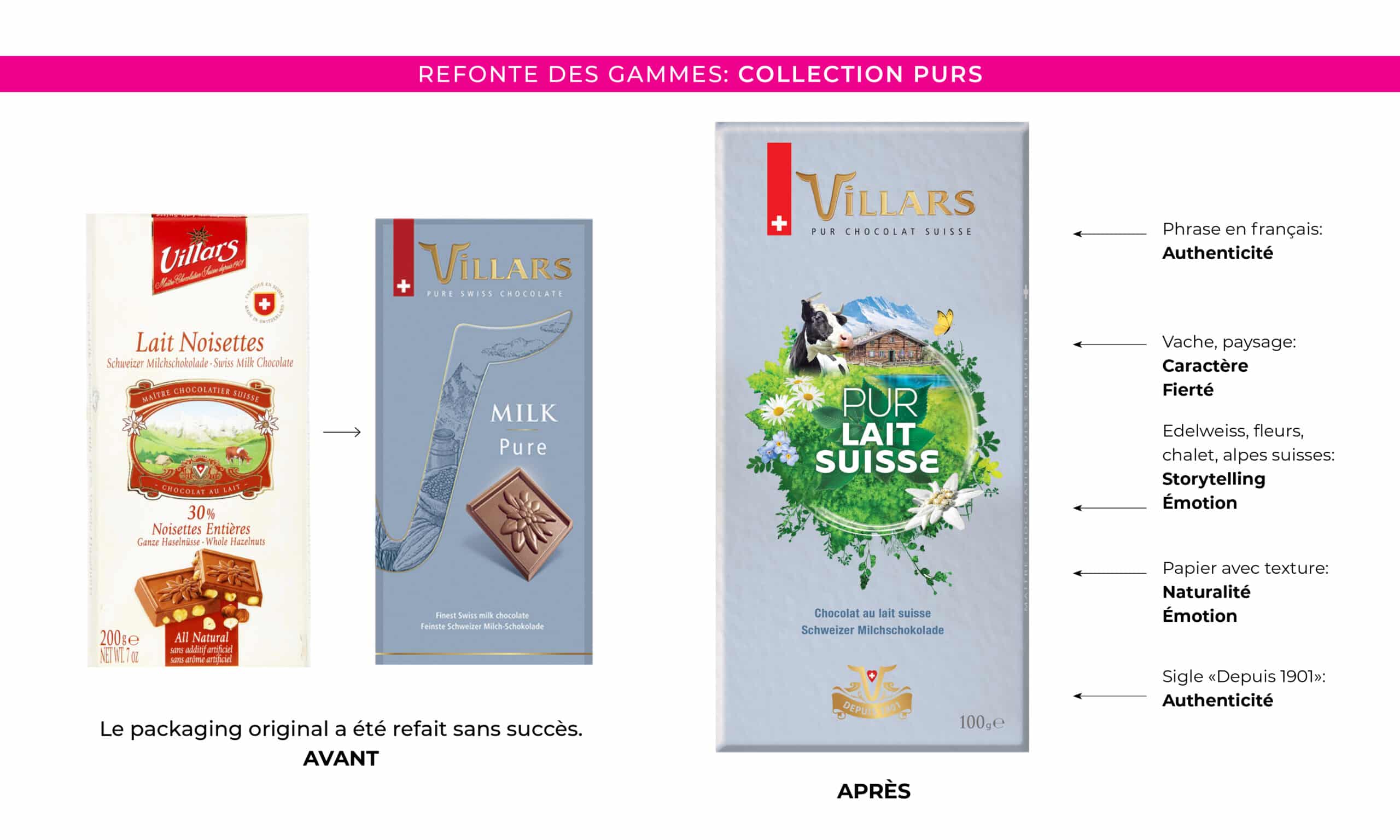 Villars Chocolats, c’est plus de 100 ans d’histoire chocolatière en Suisse. Quand le groupe Bongrain rachète la marque en 2015, il confie le rebranding à une agence externe. Résultat : les ventes s’effondrent partout dans le monde. Les consommateurs fidèles ne reconnaissent plus leur marque. Les nouveaux ne sont pas convaincus.
